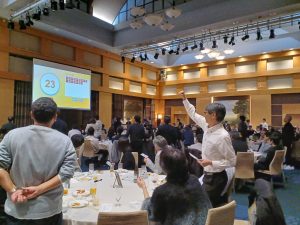 テーブルごとのチームでのクイズ大会では、豪華景品獲得のためにチームで協力して答えを考えていて、